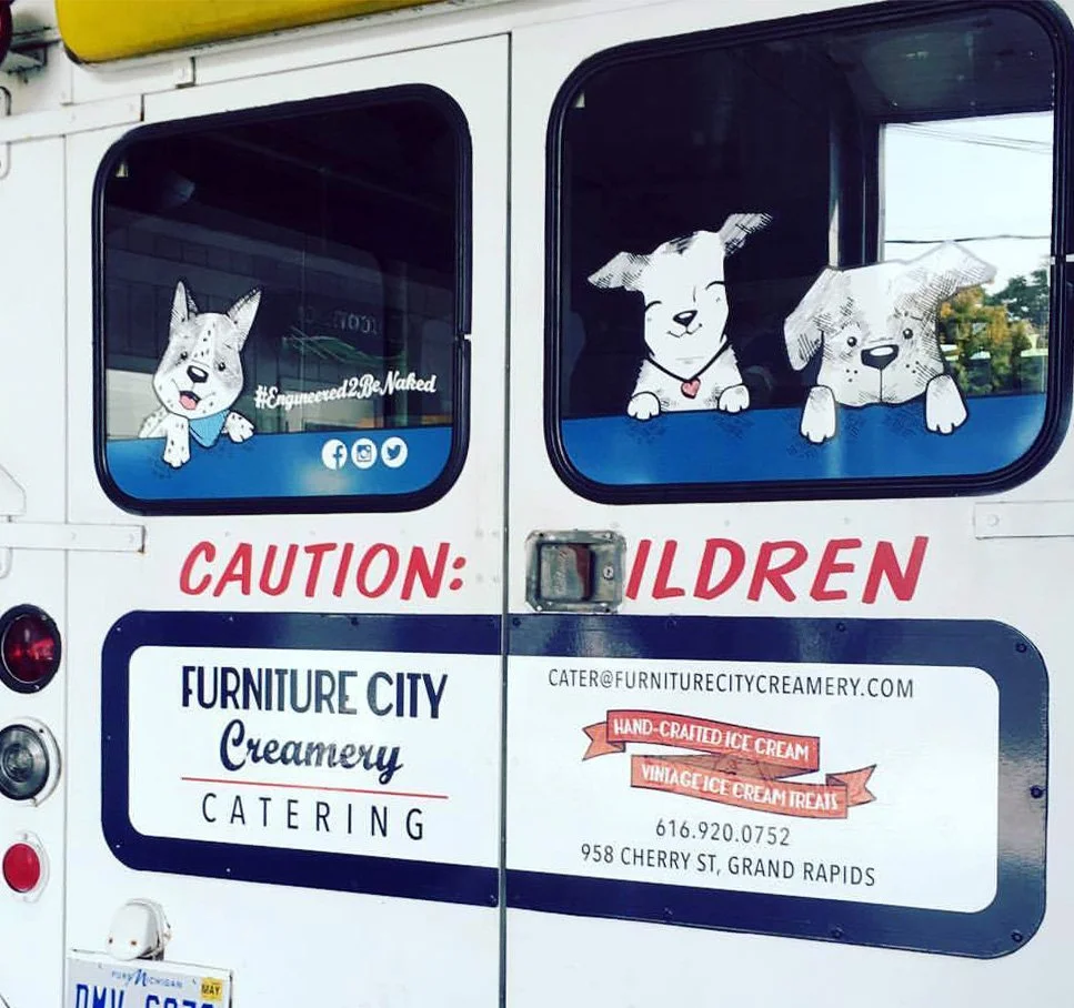 Let’s think outside of the box and cover the world with art! This one of a kind ice cream truck features custom vinyl graphics and puppy portraits.